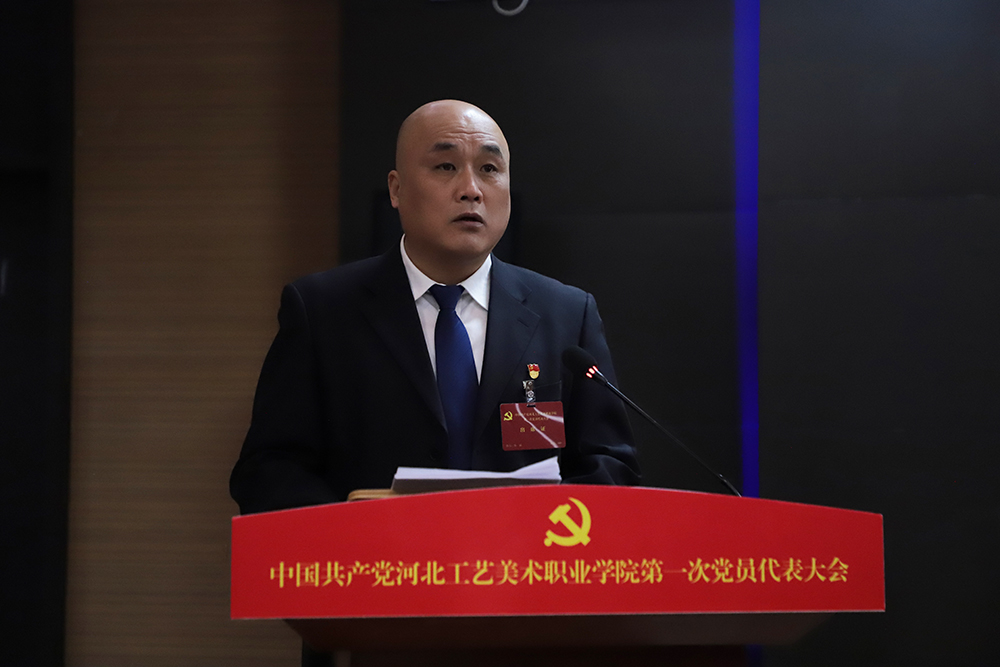 孙斌同志代表中国共产党河北工艺美术职业学院委员会向大会作题为《强化使命担当 锐意改革创新 为加快建设特色鲜明的高水平艺术类高职院校而团结奋斗》的报告。