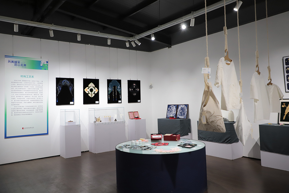 本次展览紧密围绕“源流互鉴、产教共融”的策展逻辑,设立“美育之源”“数字未来”“匠心造物”“视觉赋能”“宜居之城”五大板块,汇聚了学院美术系、数字艺术设计系、时尚工艺系、视觉传达设计系、环境艺术设计系、文化旅游产业学院以及现代纺织产业学院七大院系师生的375件(套)作品,系统呈现了从传统非遗技艺活化、数字文创IP孵化,到品牌视觉设计、城市空间艺术介入的跨学科、跨媒介创新成果。展览深度整合定瓷、曲阳石雕等河北特色非遗资源,依托产业优势,全面展现学院美育赋能产业、文创转化产品、文旅塑造品牌的实践探索,助力打造“雄安好礼”品牌矩阵,致力于将展览空间打造为雄安新区的“文化艺术会客厅”与美育实践高地。