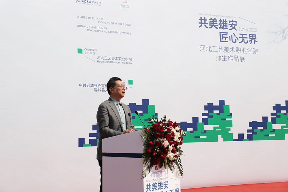 张广军在致辞中指出,本次展览是学院举办的第四届“共美雄安”主题展,正值习近平总书记2026年3月23日亲临雄安考察,主持召开深入推进雄安新区高质量建设和发展座谈会,并强调要牢牢把握雄安新区作为北京非首都功能疏解集中承载地的首要功能定位的关键时期,意义重大。学院始终将“共美雄安”系列展览作为深度链接新区文化生态、服务区域发展的重要平台,持续整合多方资源,通过系统梳理地域文化、推动文创转化,努力将雄安的文化特质转化为可感知、可传播的美学成果。他号召全体师生与工艺美术工作者,不仅要“来到雄安”,更要深度“融入雄安、建设雄安”,以更具规模、更富建设性的艺术实践,回应国家建设文化强国的目标,真正为新时代创新高地和高质量发展样板注入深厚的文化动能。