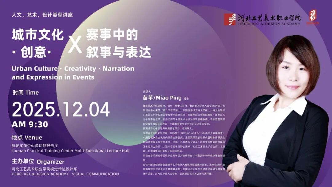 12月4日上午9:30,亚洲城市文化国际海报展总策划兼总策展人、鲁迅美术学院人文学院(大连)创新创业中心主任苗苹博士在河北工艺美术职业学院鹿泉实践中心为视觉传达设计系师生开展讲座。