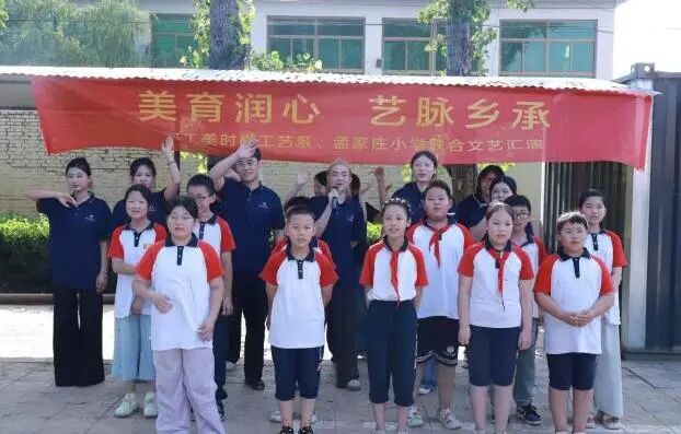 实践团队与孟家庄小学联合举办了“美育润心·艺脉乡承”主题文艺汇演。本次活动以艺术展演为载体,创新思政教育形式,通过我系学生与小学生同台演出、互动交流,打造了一堂生动活泼的思政实践课。汇演中集体朗诵《少年强则国强》将汇演推向高潮,得到200余名师生以及家长一致好评。活动尾声,时尚工艺系党总支副书记张玉英代表实践团队赠予孟家庄小学福字,愿这抹炽热的红,化作他们课桌上的晨曦,笔尖上的星光,照亮前方。本次汇演,实现了思政教育的入脑入心,小学生们在艺术熏陶中深化了爱国情怀,大学生们在指导排练中强化了使命意识,充分展现了新时代青年与少年儿童携手共进、同心筑梦的精神风貌,为乡村振兴注入了青春力量。